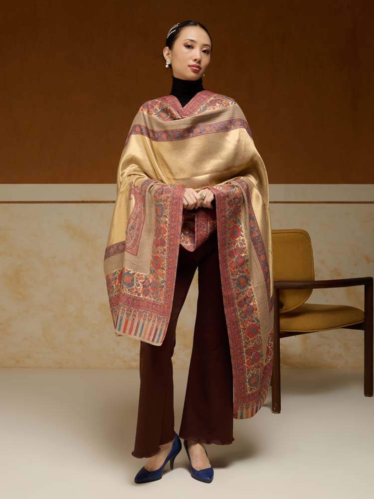 For a rich, traditional look, the Naqqashi Royale Kalamkari Zari Shawl – Scarlet Gold features fine embroidery and deep textures, which are great for winter evening events.