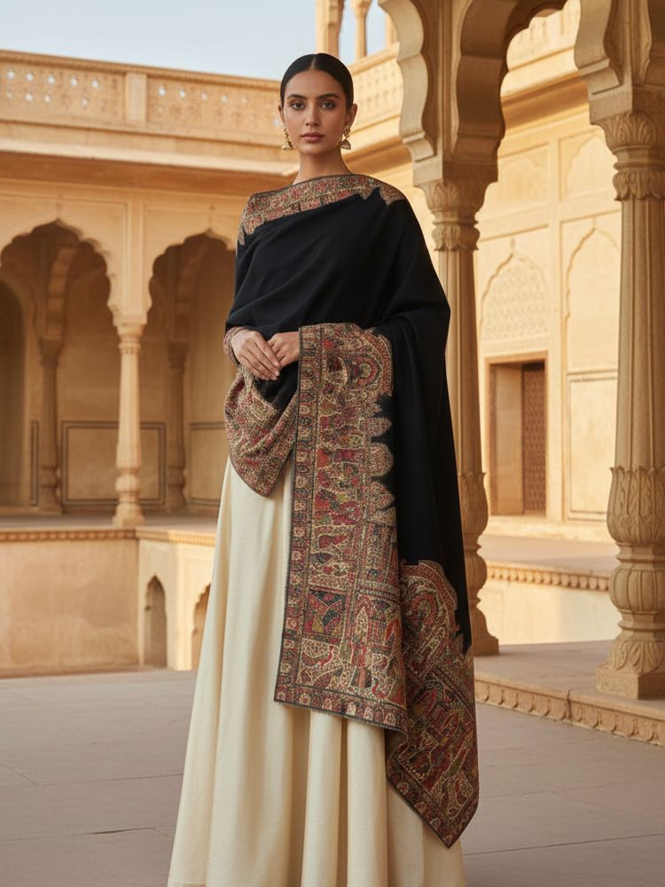 For men, border work shawls are particularly easy to wear. The simple design—embroidery confined to the edges—keeps the look understated and dignified. Whether paired with a kurta, bandhgala, or even a winter coat, it adds warmth and quiet sophistication.