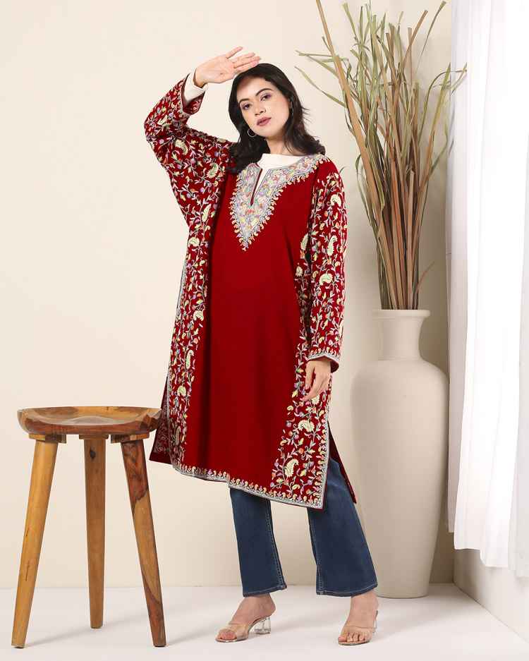 - Example: Bajoo Jaal Ari Hand-Embroidered Phiran – Deep Red