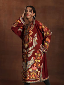 Ambi Buteh Palla Hand Emb Wool Phiran - Navy, Crimson