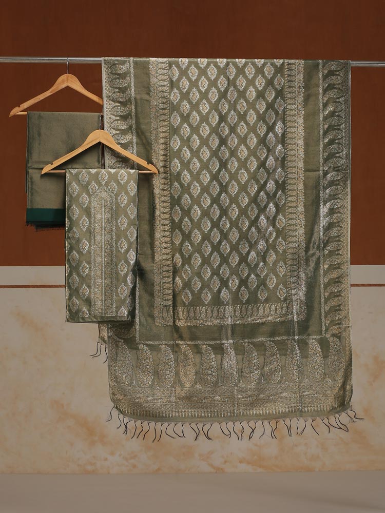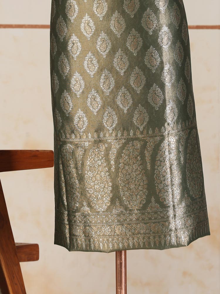 The kurti and dupatta are beautifully woven with intricate motifs, blending traditional artistry with a refined contemporary aesthetic. The salwar fabric comes in a coordinated plain tone, offering balance and versatility to the ensemble.