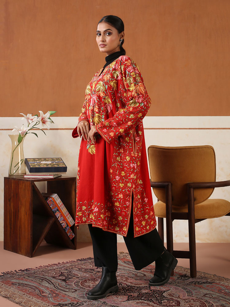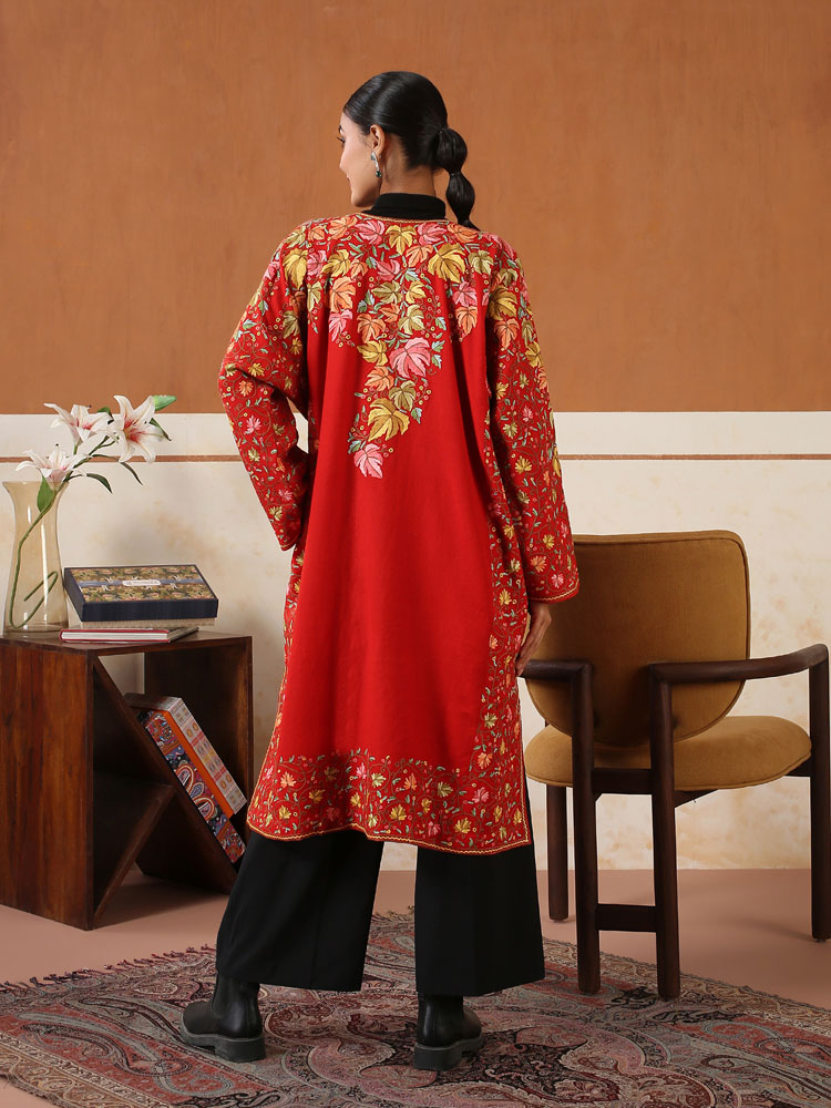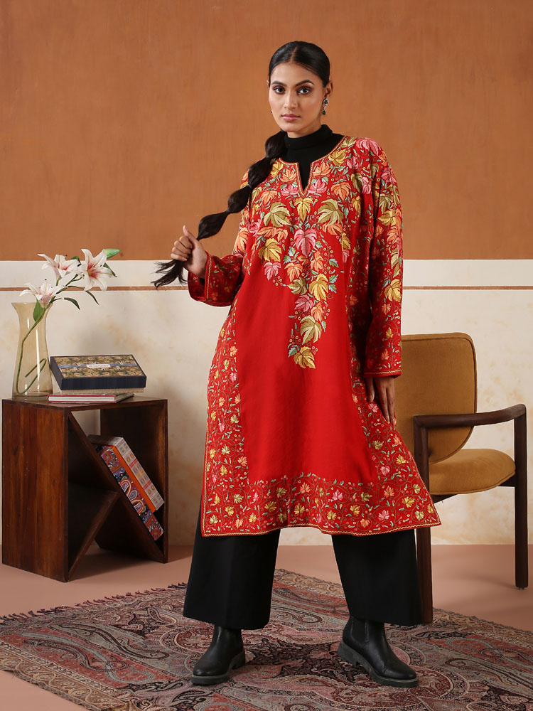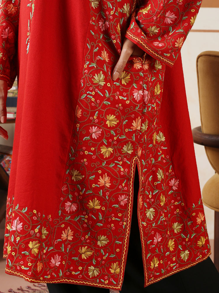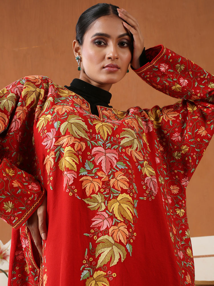 Chinar Jaal Ari Wool Hand Emb Phiran – Barn Red