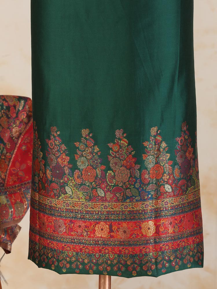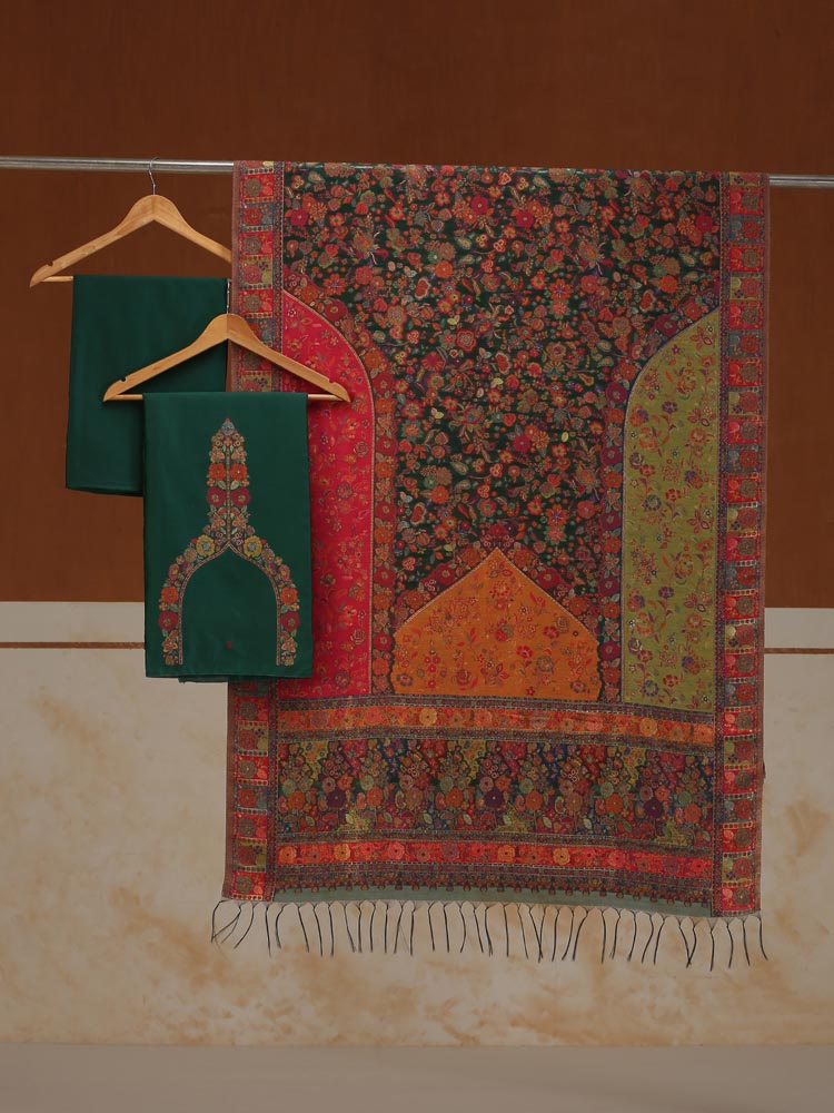 Experience the timeless charm of Kashmiri craftsmanship with this unstitched three-piece suit set, comprising kurti, salwar, and dupatta, each measuring 2.5 metres for effortless tailoring across all sizes and silhouettes.