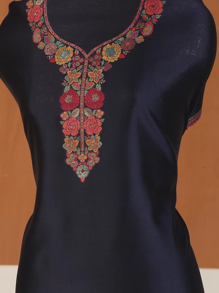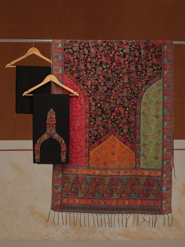Experience the timeless charm of Kashmiri craftsmanship with this unstitched three-piece suit set, comprising kurti, salwar, and dupatta, each measuring 2.5 metres for effortless tailoring across all sizes and silhouettes.