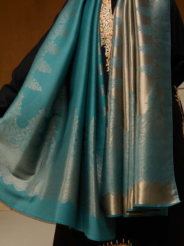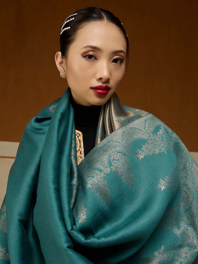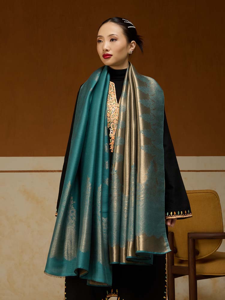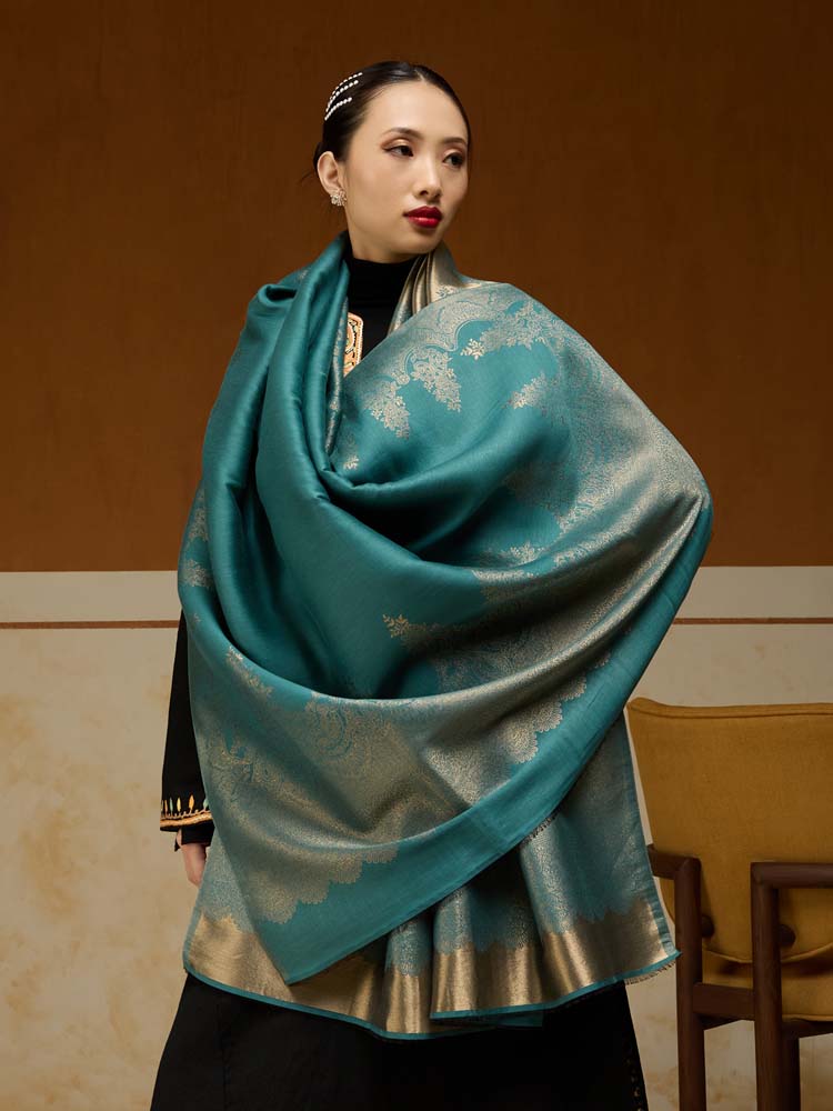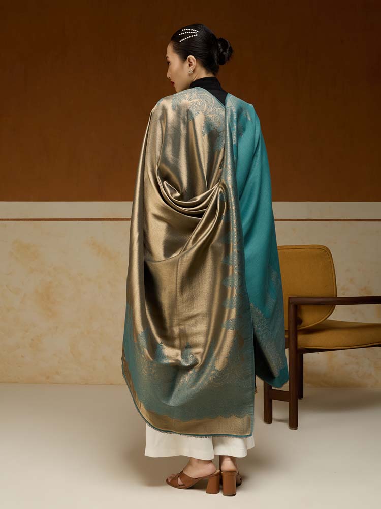 A luminous reversible shawl where gold metallic threads meet soft tones of woven artistry. The paisleys shimmer differently on each side, revealing two moods of the same royal story.