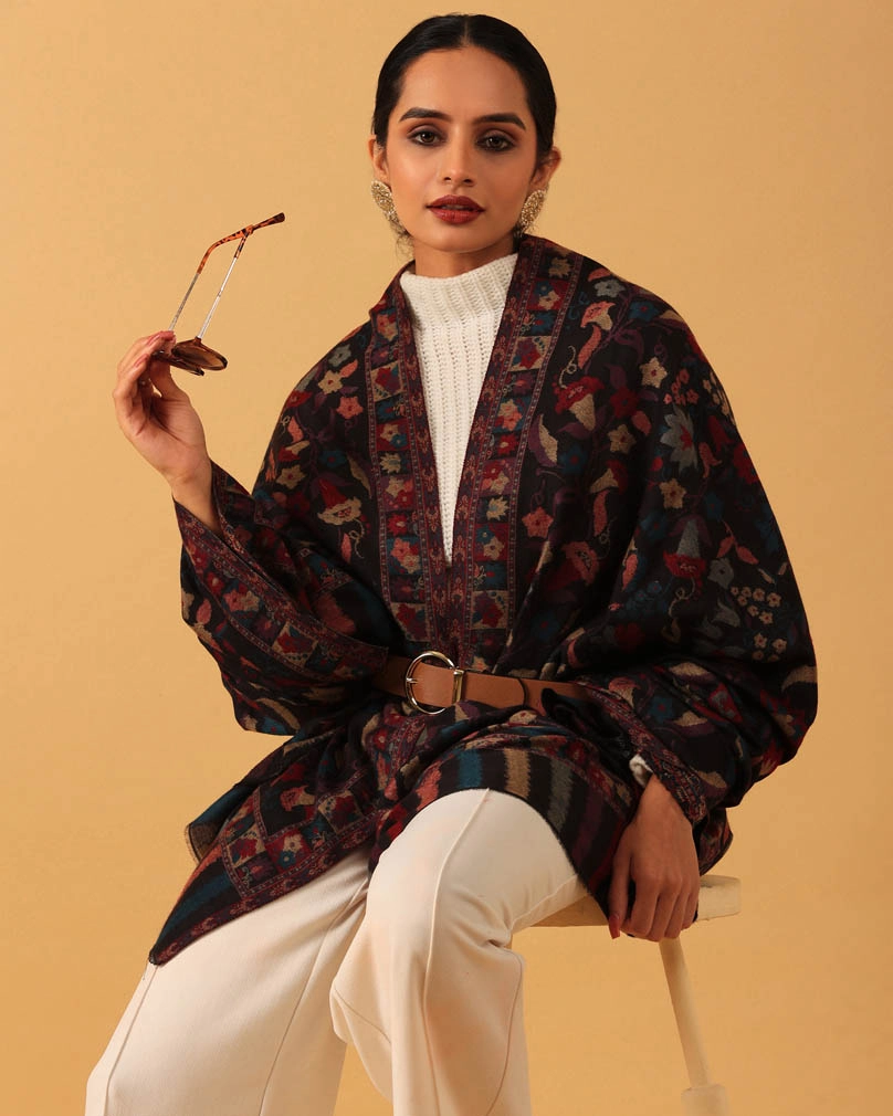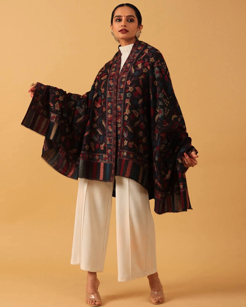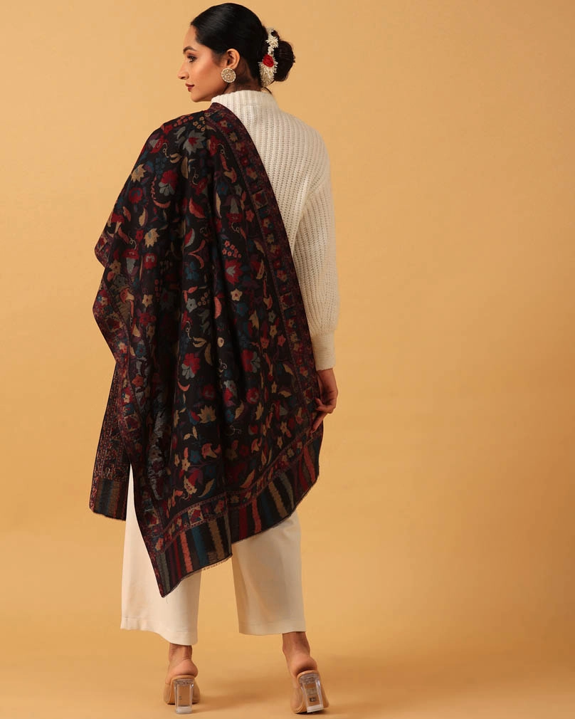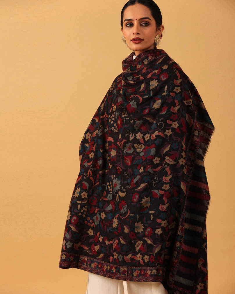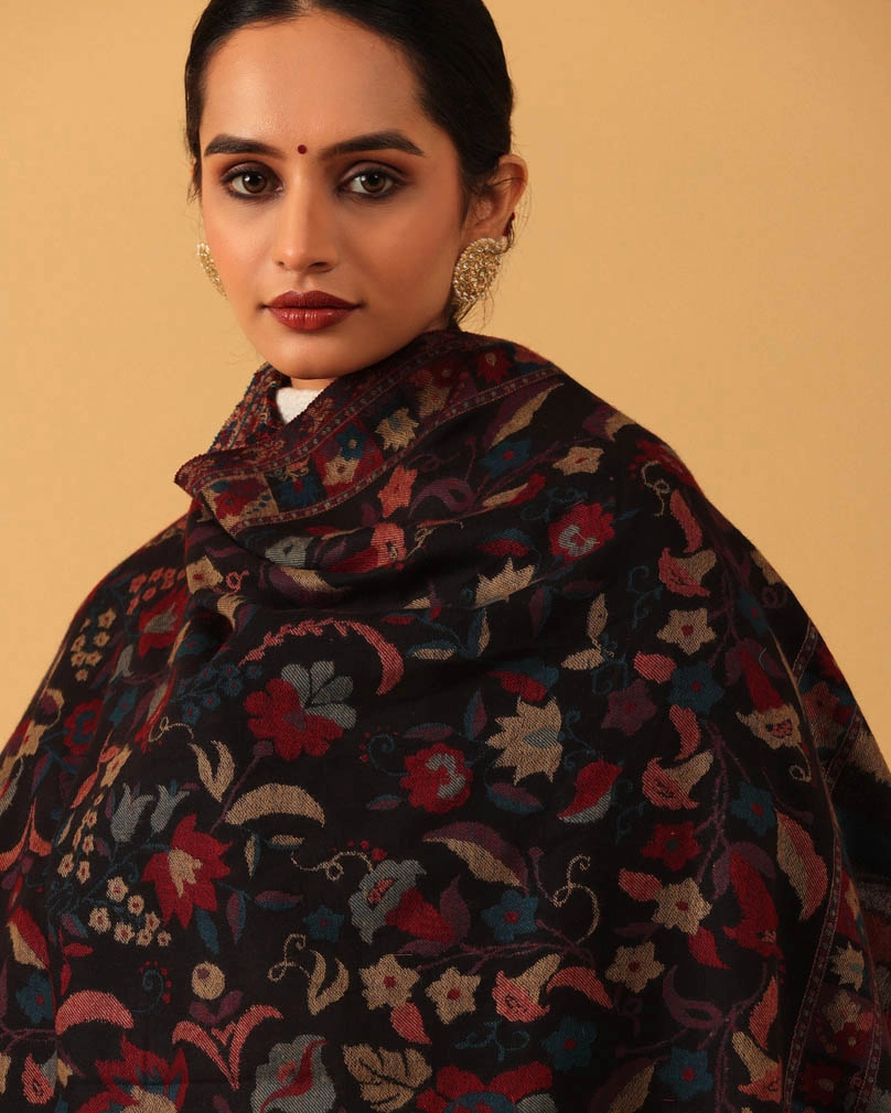 A woolen shawl inspired from traditional paisley and floral butehs woven in vintage Kani Weaves. The piece uses a vibrant and bright color palette of ink blue, brick red and fawn on a black base.
