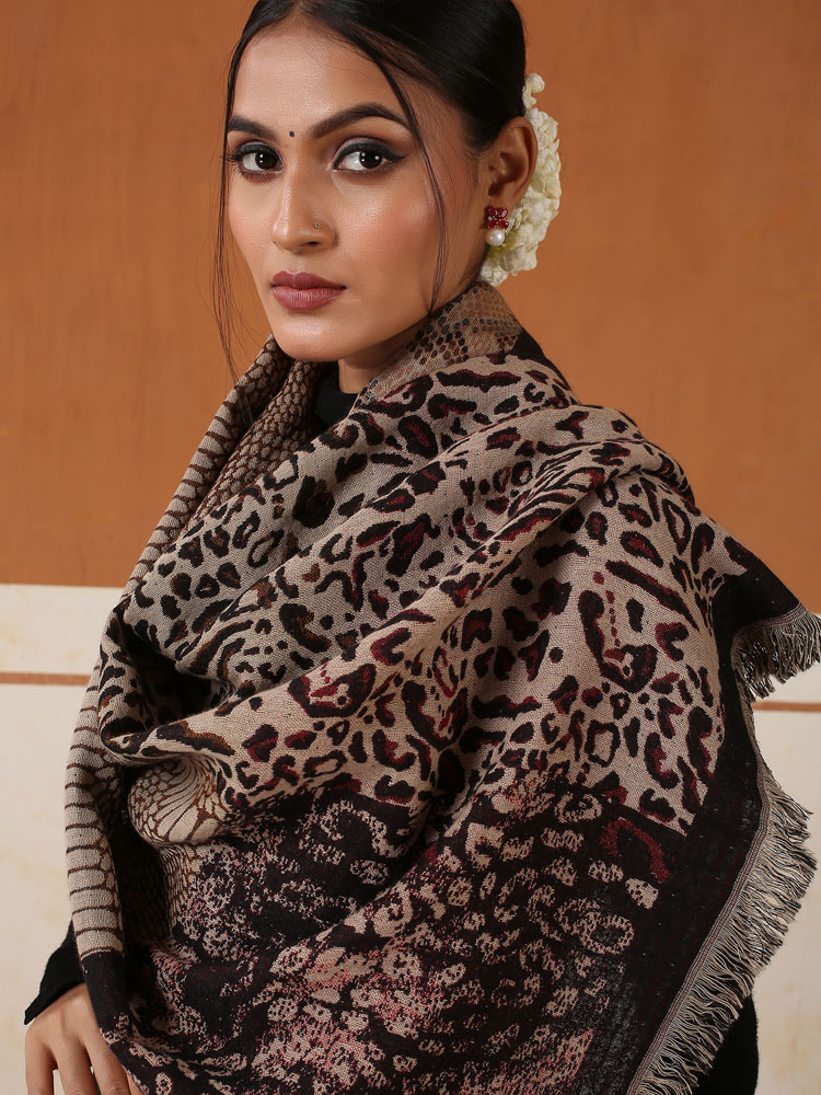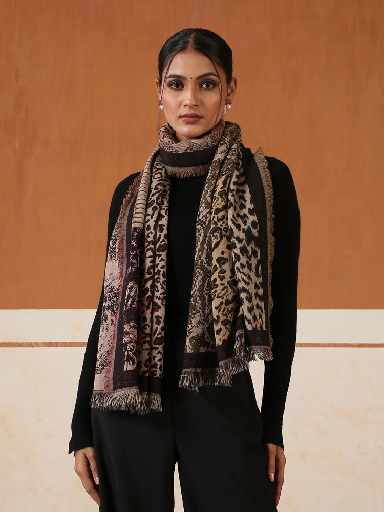 A versatile scarf/stole woven in a fine blend of wool and cotton, featuring animal-inspired weaves and prints that add a touch of bold sophistication.