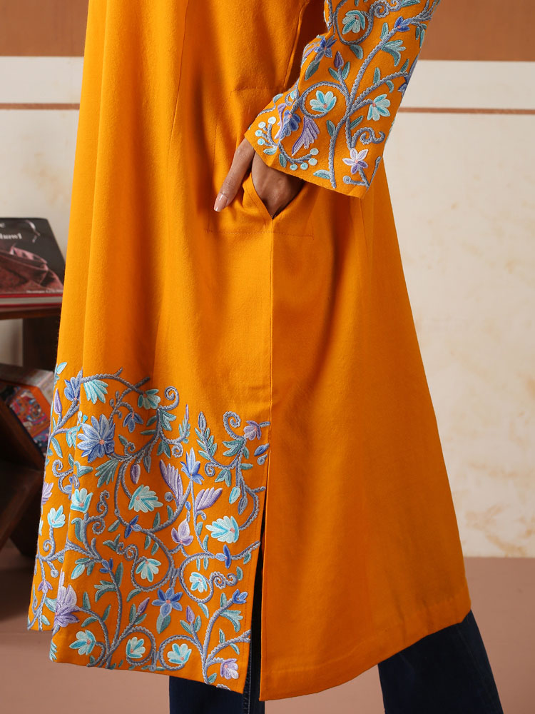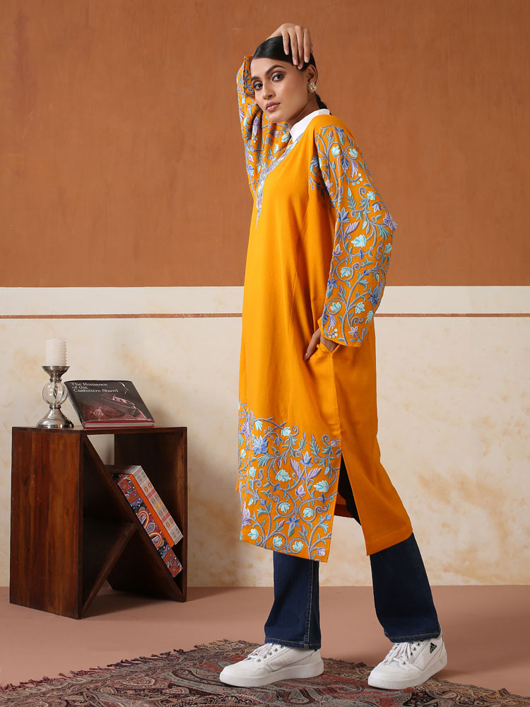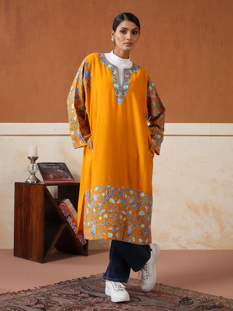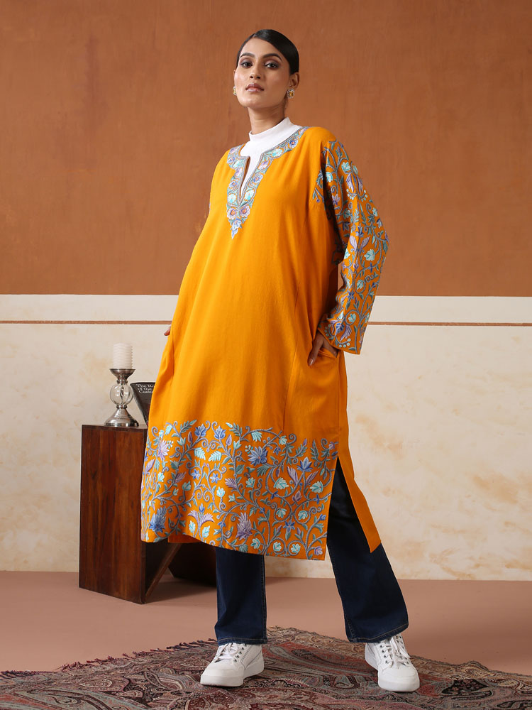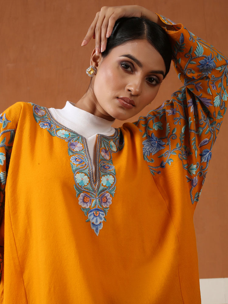 Pure wool phiran, finished with intricate ari hand embroidery — a testament to timeless Kashmiri craftsmanship.