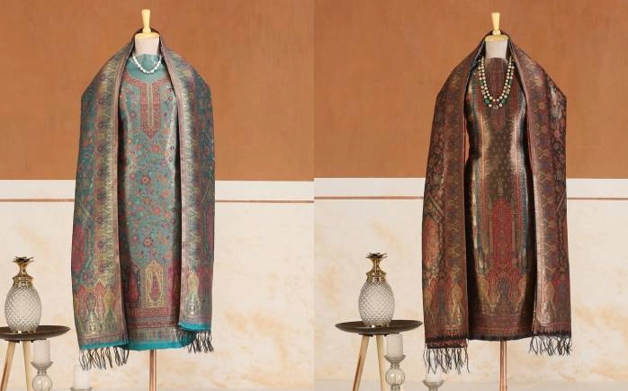 Eimaan Paisley Kani Silk Suit Fabric – Jewel Teal is an excellent pick for evening events and Eimaan Paisley Kani Silk Suit Fabric – Medallion Gold provides a warm, festive glow that isn’t too loud.